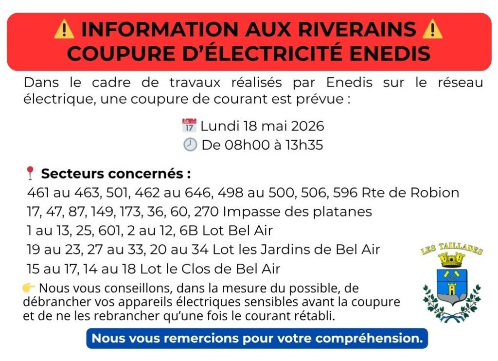 Afin d’améliorer la qualité de la distribution électrique et de répondre aux besoins de leur clientèle, la société Enedis réalisera des travaux sur le réseau électrique des quartiers suivants ce qui entraînera des coupures d’électricité :