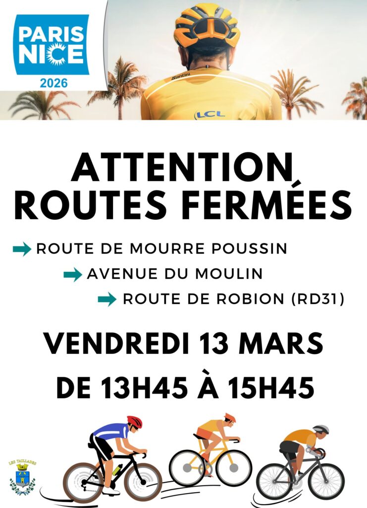 En raison du passage du Tour « PARIS-NICE » le vendredi 13 mars 2026, les routes suivantes seront totalement fermées à la circulation de 13h45 à 15h45 :